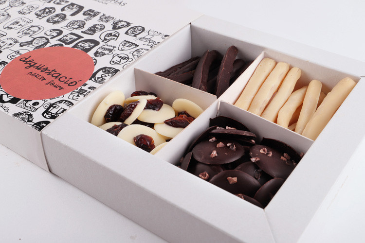 Ingredients: Blat de moro fregit amb xocolata blanca (25%) [xocolata blanca (71%) (sucre, mantega de cacau, Llet sencera en pols, emulgent: lecitina de gira-sol, aroma natural de vainilla. Cacau: 31% mínim), blat de moro fregit (24%) (blat de moro, oli de gira-sol, sal marina), sal marina, agents de recobriment (goma aràbiga, sucre, xarop de glucosa i goma shellac)], Bombó de macadàmia (25%) [xocolata blanca (59%) (sucre, mantega de cacau, Llet sencera en pols, emulgent: lecitina de gira-sol, aroma natural de vainilla. Cacau: 31% mínim), Macadàmia torrada (37%), cacau en pols (4%)], Nabiu vermell i xocolata negra amb edulcorants (25%) [xocolata negra (57%) (pasta de cacau, edulcorants (eritritol, sucralosa, glucòsids d’esteviol), mantega de cacau, inulina, cacau desgreixat en pols, emulgent: lecitina de gira-sol, aroma natural de vainilla, aroma. Cacau: 61,5% mínim), nabiu vermell deshidratat (43%) (nabiu vermell, suc concentrat de poma, oli de gira-sol)], Temptació de taronja (25%) [xocolata negra (59%) (pasta de cacau, sucre, mantega de cacau, cacau desgreixat en pols, emulgent: lecitina de gira-sol i aroma natural de vainilla. Cacau: 64% mínim), trossets de pell de taronja confitada (40%) (pell de taronja, sucre, fructosa, dextrosa, maltosa, conservant: sorbat potàssic, acidulant: àcid cítric), agents de recobriment (goma aràbiga, sucre, xarop de glucosa i goma shellac)].
