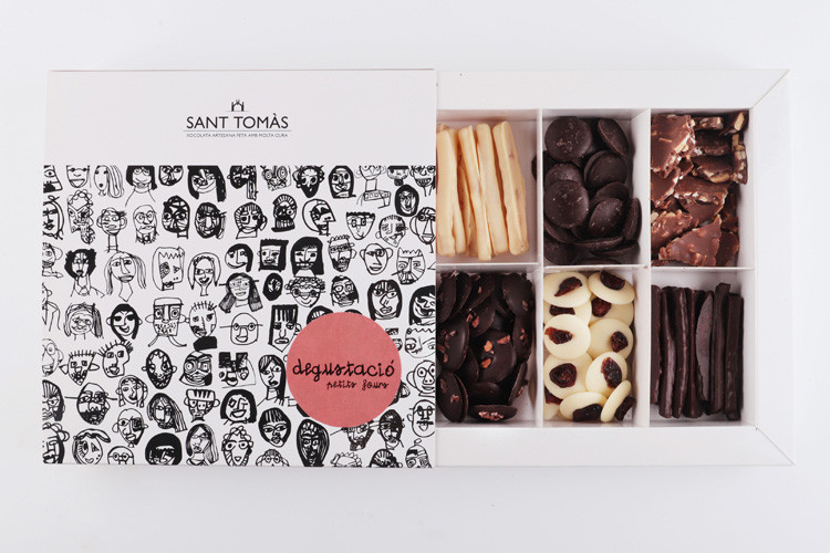 Ingredients: Tira de taronja amb xocolata negra (16,66%) [pell de taronja confitada (55%) (pell de taronja, sacarosa, fructosa, dextrosa, maltosa, conservador: E-202, acidulant: E-330), xocolata negra (43%) (pasta de cacau, sucre, mantega de cacau, cacau desgreixat en pols, emulgent: lecitina de gira-sol, aroma natural de vainilla. Cacau mínim 64%), cacau en pols]. Tira de llimona amb xocolata blanca (16,66%) [xocolata blanca (58%) (sucre, mantega de cacau, Llet sencera en pols, emulgent: lecitina de gira-sol, aroma natural de vainilla. Cacau mínim 28%), pell de llimona confitada (42%) (pell de llimona, sacarosa, fructosa, dextrosa, maltosa, conservadors: E-202, acidulant: E-330)]. Blat de moro fregit amb xocolata blanca (16,66%) [xocolata blanca (71%) (sucre, mantega de cacau, Llet sencera en pols, emulgent: lecitina de gira-sol, aroma natural de vainilla. Cacau mínim 28%), blat de moro fregit (28%) (blat de moro, oli de gira-sol, sal marina), agents de recobriment (goma aràbiga, sucre, xarop de glucosa i goma shellac)]. Blat de moro fregit amb xocolata negra (16,66%) [xocolata negra (75%) (pasta de cacau, sucre, mantega de cacau, cacau desgreixat en pols, emulgent: lecitina de gira-sol, aroma natural de vainilla. Cacau mínim 64%), blat de moro fregit (24%) (blat de moro, oli de gira-sol, sal marina), sal marina (0,6%), agents de recobriment (goma aràbiga, sucre, xarop de glucosa i goma shellac)]. Bombó de macadàmia (16,66%) [xocolata blanca (62%) (sucre, mantega de cacau, Llet sencera en pols, emulgent: lecitina de gira-sol, aroma natural de vainilla. Cacau mínim 28%), Macadàmia torrada (34%), cacau en pols (4%)]. Nabiu vermell amb xocolata negra i edulcorants (16,66%) [xocolata negra (56%) (pasta de cacau, edulcorants (eritritol, sucralosa, glucòsids d’esteviol), mantega de cacau, inulina, cacau desgreixat en pols, emulgent: lecitina de gira-sol, aroma natural de vainilla, aroma. Cacau mínim 61,5%), nabiu vermell deshidratat (43%) (nabiu vermell, suc concentrat de poma, oli de gira-sol), cacau en pols].