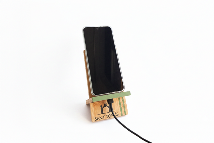 Descubre nuestro soporte de madera para móvil, el accesorio ideal para tener tu teléfono siempre bien colocado y visible. Fabricado en madera, cada pieza está pintada de manera artesanal por las personas de nuestra entidad. Dispone de un orificio que permite pasar el cable del cargador, de modo que puedes cargar el móvil mientras lo usas.